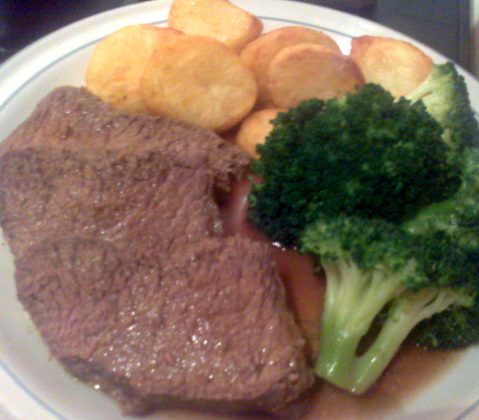 I served it up with some (Aunt Bessie’s – oh the shame!) roast potatoes and broccoli. I made a gravy by adding the meat juices (sieved) to 300ml boiled water with a beef Oxo cube in it. Simple and delish!