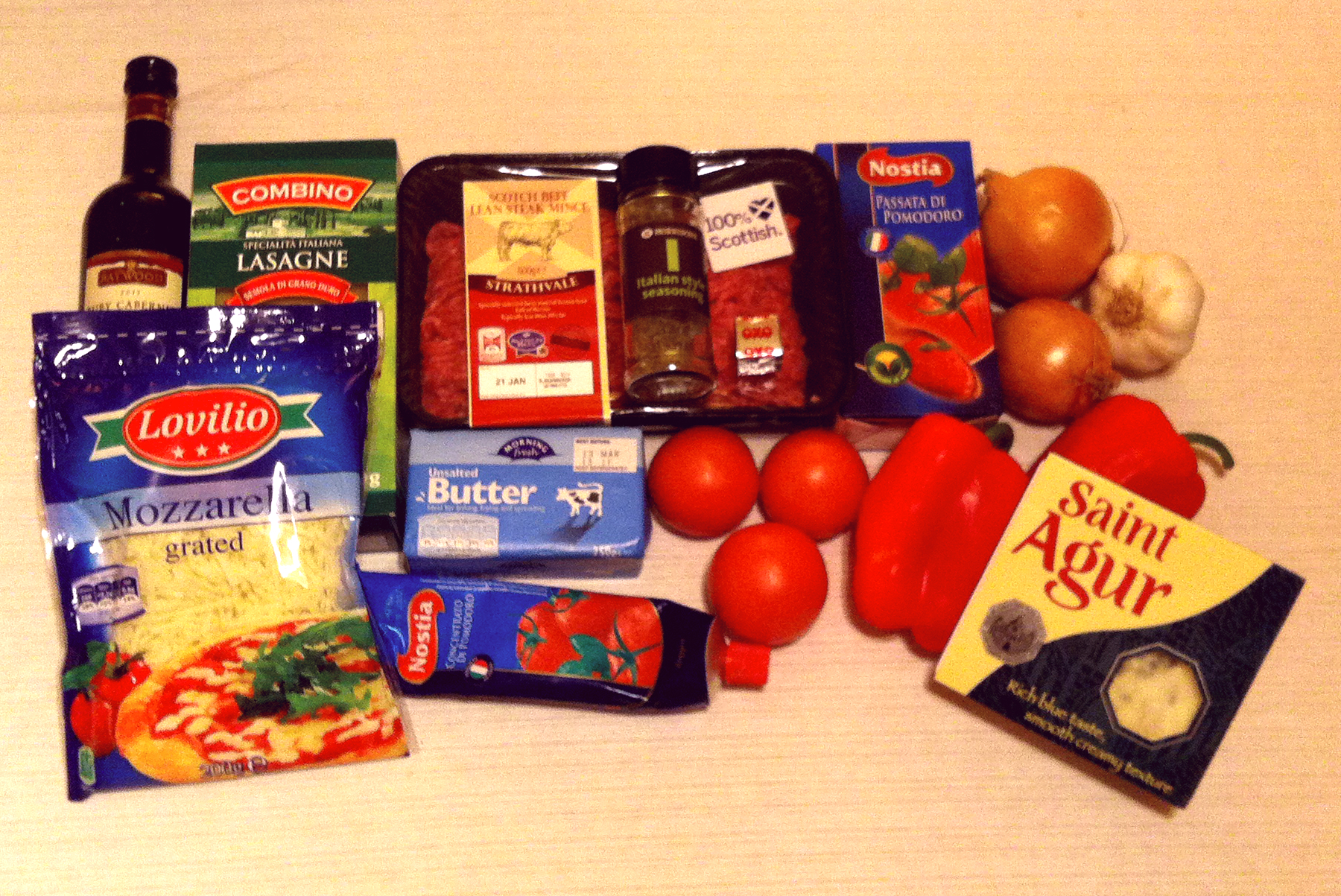 I padded the mince out with some red peppers and chopped tomatoes; I thought it would be a nice contrast to the tangy blue cheese. Since I don’t drink, I just bought a teeny bottle of wine for around £1.50. Some people are particular about the type of wine they cook with. I’m not. When you add red wine to a dish like lasagne, you’ll undoubtedly improve the flavour of the dish, but you’re not going to detect the “accent of black cherry” or “pungent aroma of vanilla”.