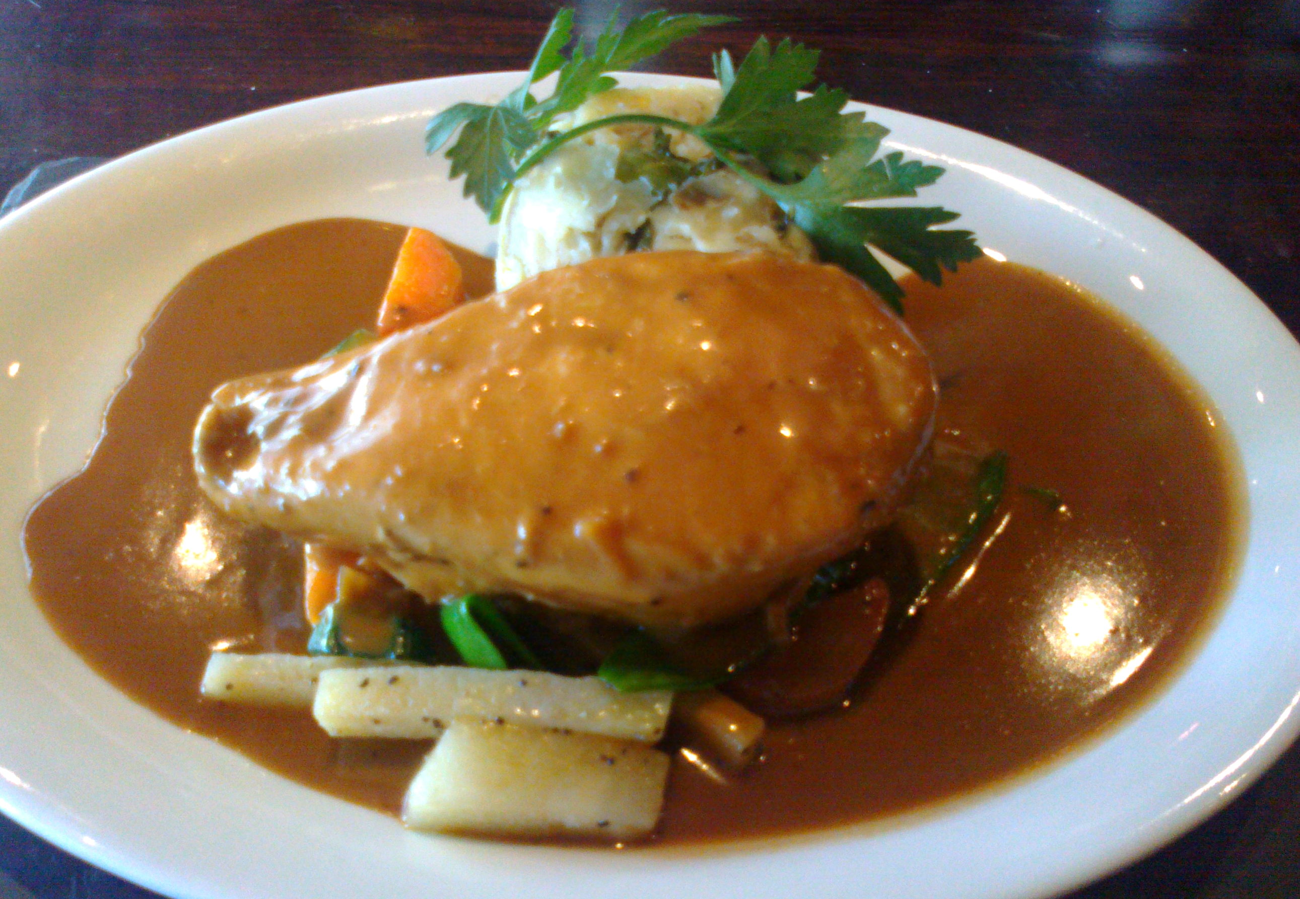 I finally chose the Chicken in the Heather – “Chef’s creation of a tender chicken breast, cooked in French mustard, honey, garlic and cream, served with Rumbledethumps and fresh vegetables”. Rumbledethumps, by the way, is “a dish from the Scottish Borders consisting of crushed potatoes, onions and cabbage, similar to the Irish Colcannon“.