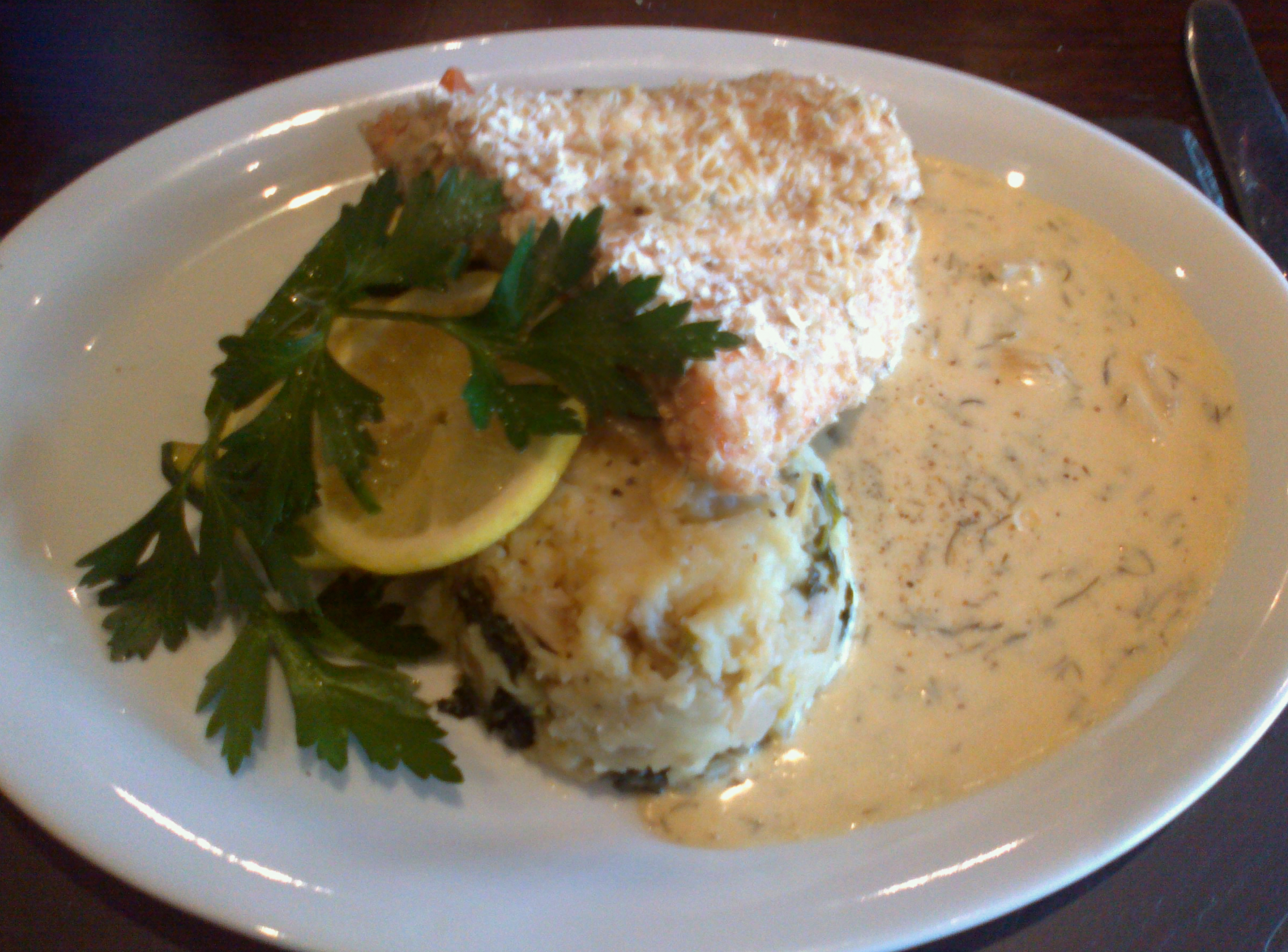 Irene was delighted with the salmon; it was a very generous portion! We both loved the concept of it being rolled in oats, and she devoured the plate.Â