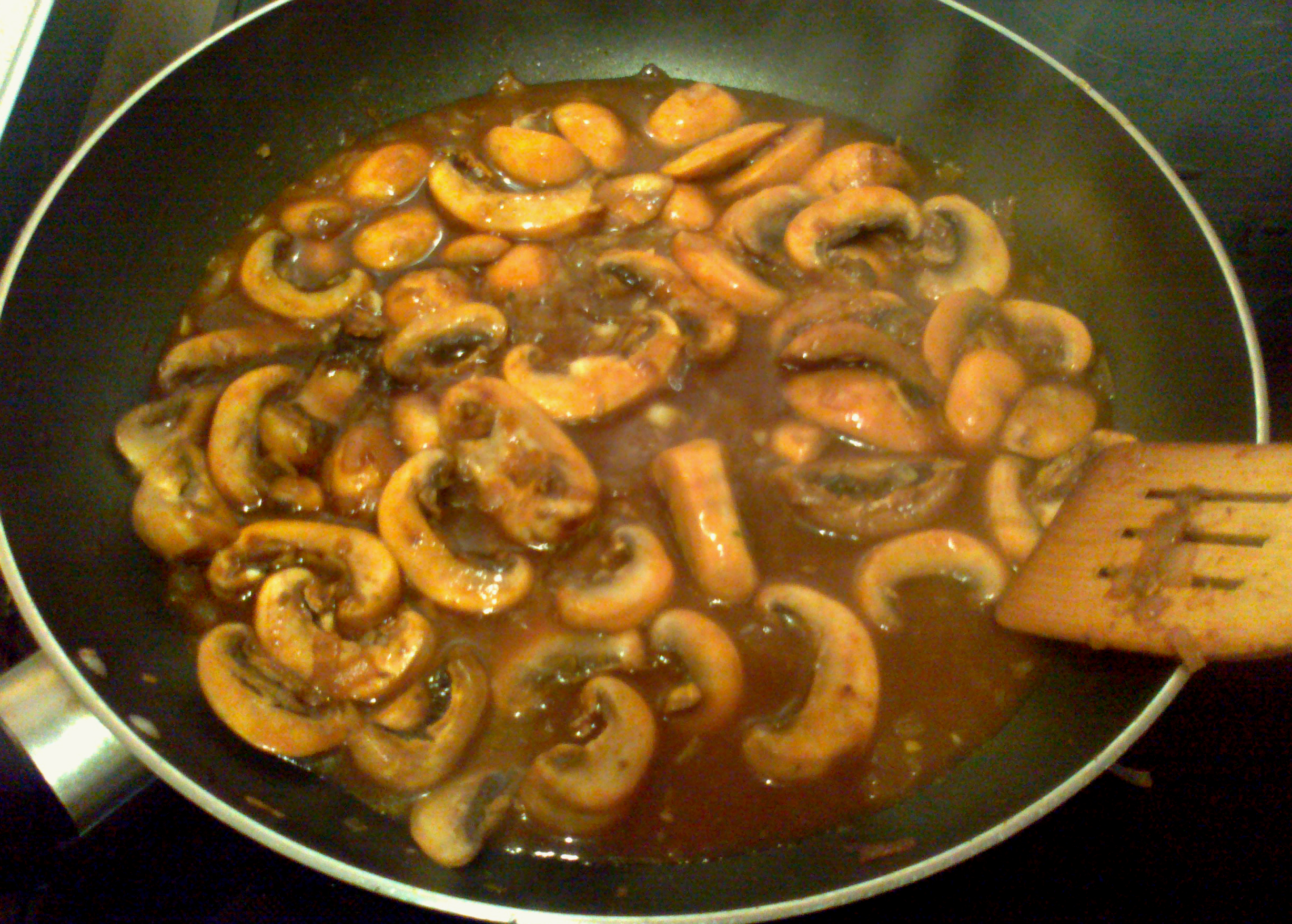 I added the mushrooms, sautéed for 5 minutes more, then added the stock and Worcestershire sauce