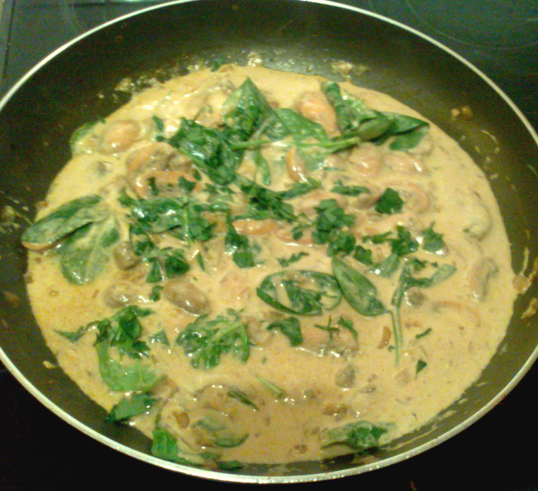 I simmered for a further 5mins, letting the liquid reduce slightly, then took it off the heat. I stirred in my soured cream and spinach and topped with parsley. The spinach will wilt with the heat of the dish.