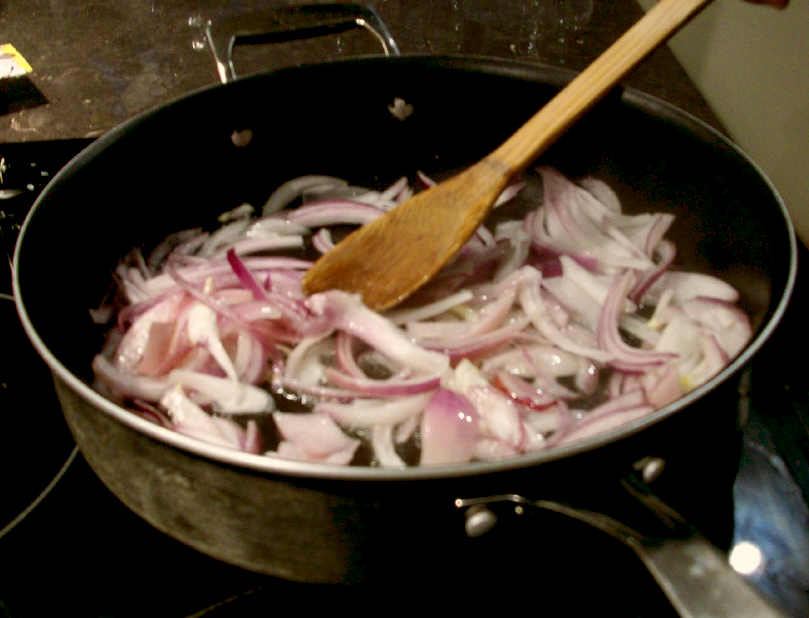 First, David sauteed the onions in oil until they began to brown.
