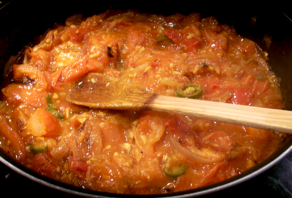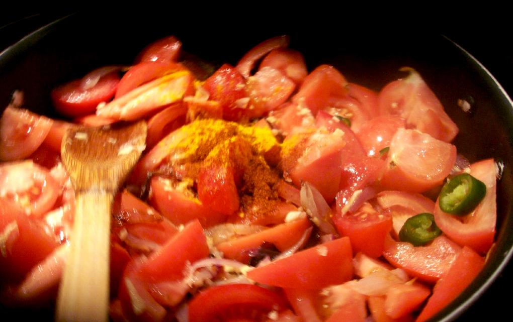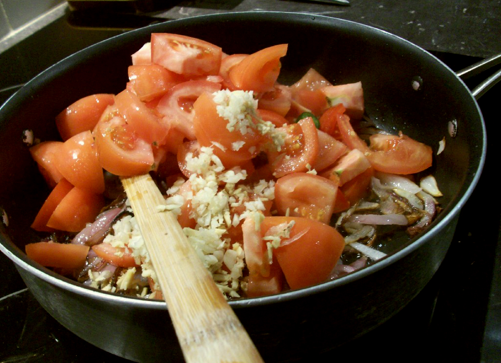 He then added the tomatoes, followed by half the garlic, ginger and chillies.