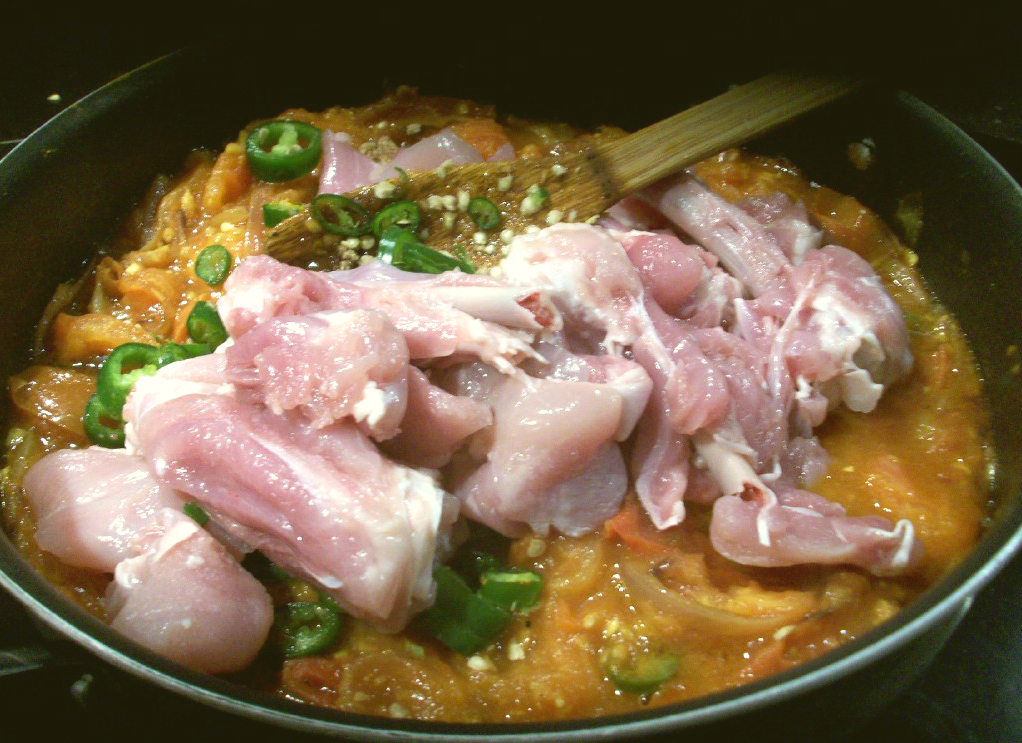 At this point, he seasoned to taste, added the brown sugar, then covered the chicken with water. He brought it to the boil then simmered gently until the chicken was cooked through.