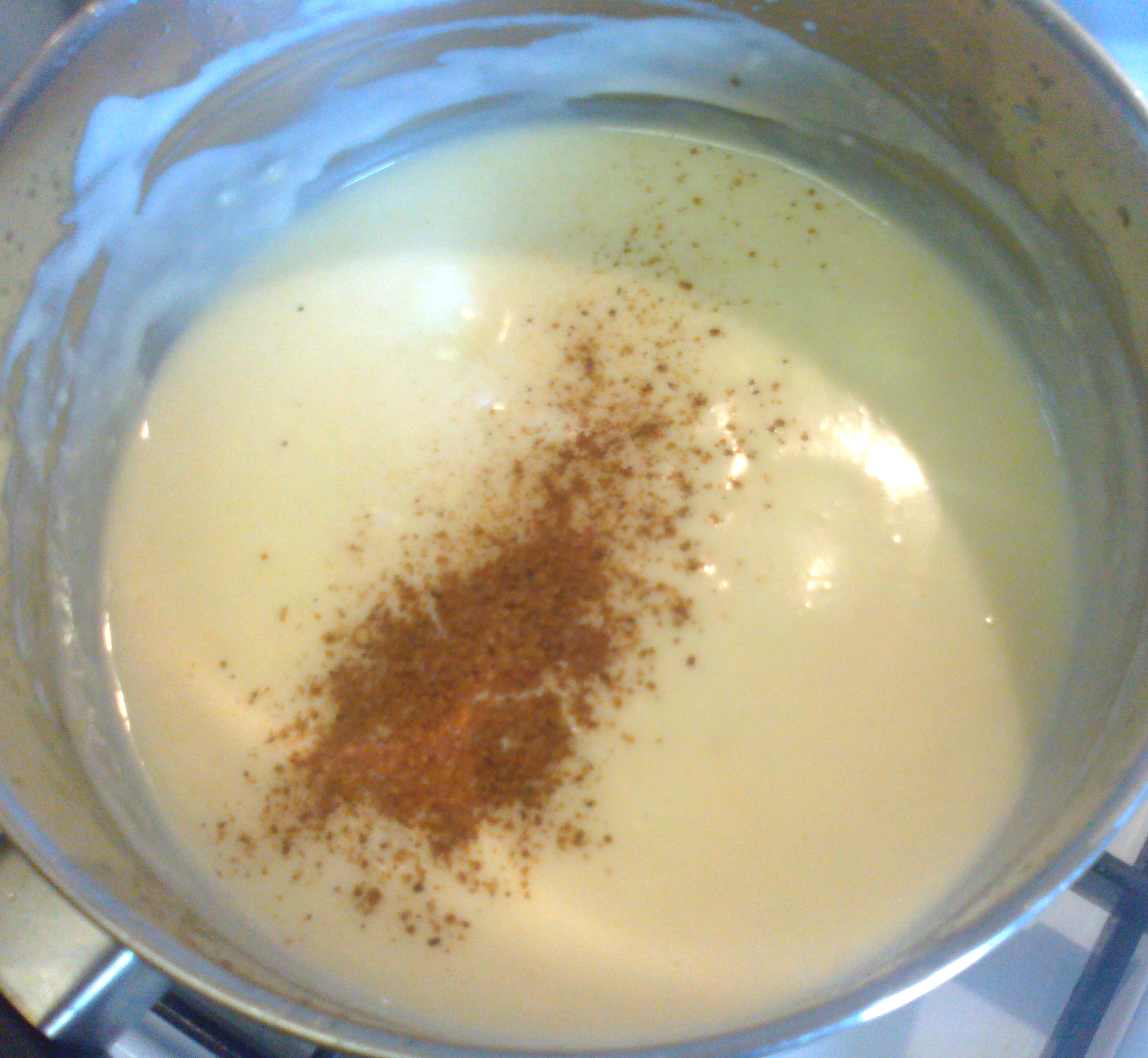 On a medium heat, I added my milk (yep, the whole lot), and whisked all the lumps out of it. This is the part where you think it’s NEVER going to thicken or de-lump. But, after a few minutes, the consistency starts to smooth out and thicken. I took it off the heat and stirred in my nutmeg.