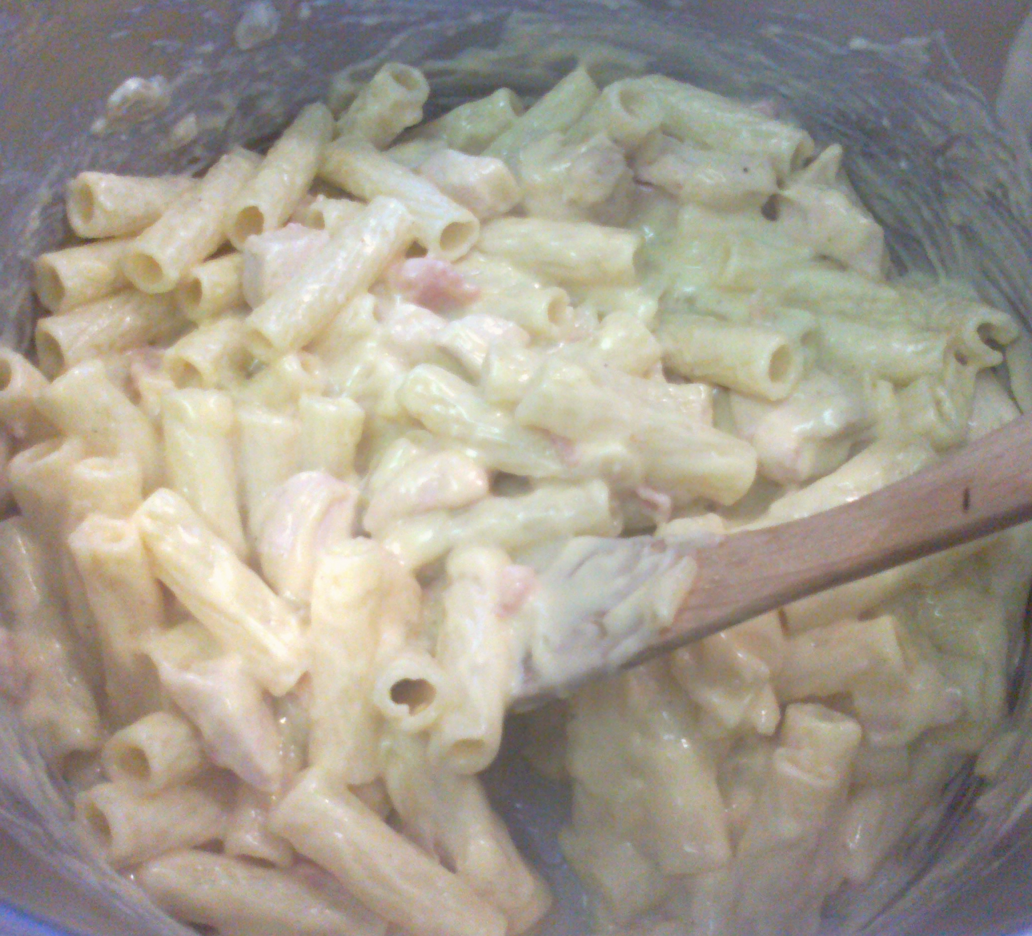 Next, I stirred in about 2/3 of my cheese and it turned into a smooth, saucy consistency. I poured it into my pasta, along with the chicken and bacon. I gave it a good stir and checked for seasoning. It didn’t require any extra salt, as the flavours were quite strong.