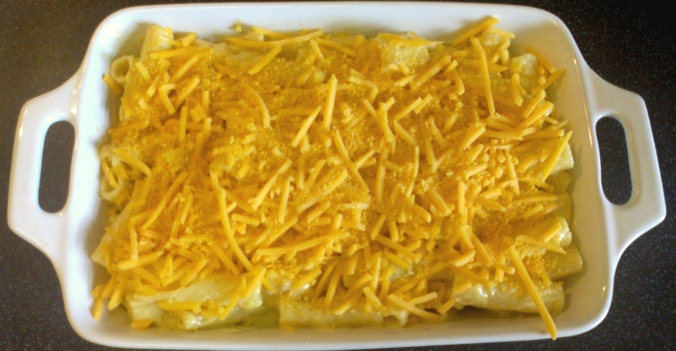 I poured it all into an oven proof dish, and covered with the remaining cheese and my breadcrumbs (which were an afterthought, hence not being in the Ingredients pic).