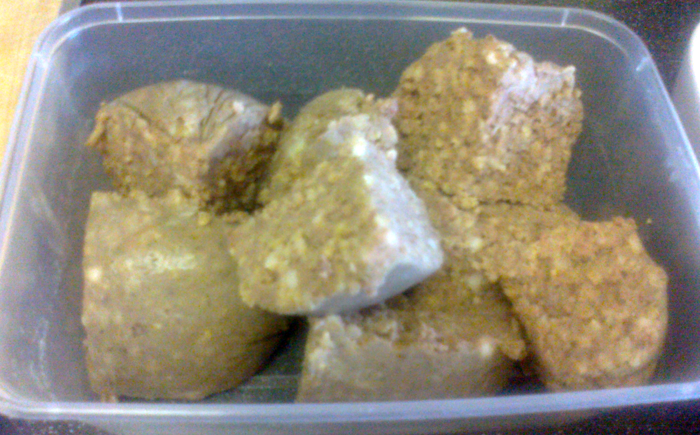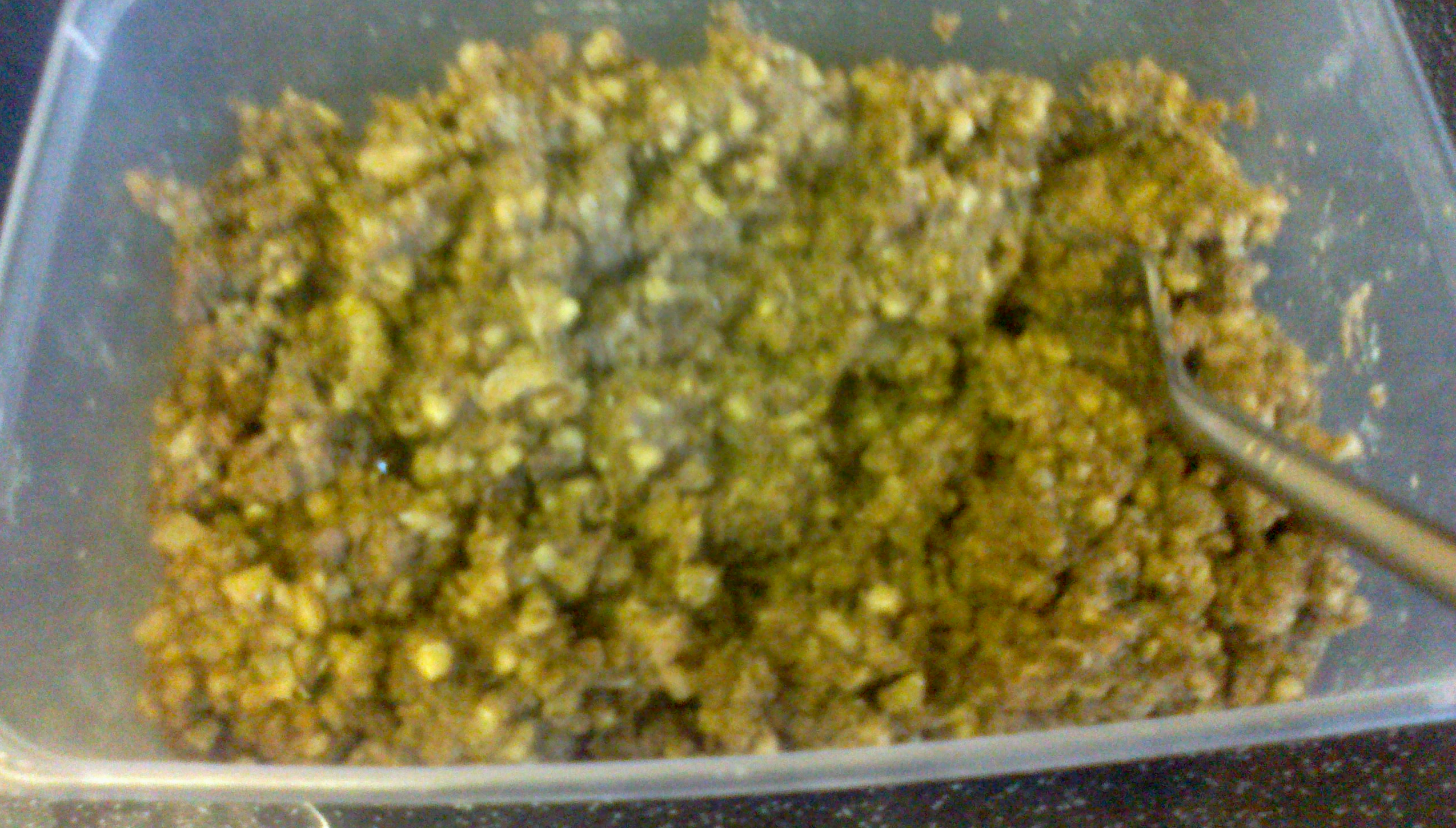 I cut my haggis down the middle, removed the outer casing, then cut into smaller chunks before placing in a microwaveable dish. I microwaved the haggis for 5 minutes (on the high setting), then bashed down with a fork, so it looked like this: